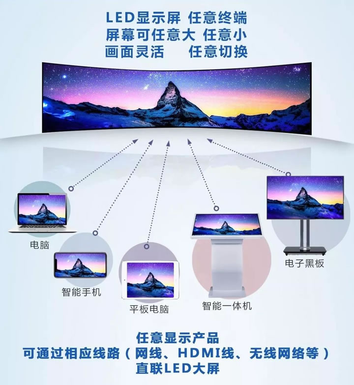 任意終端可通過相應線路(網絡、HDMI線、無線網絡等)直連LED大屏,實現小屏大屏同步互聯,通過小屏控制大屏,釋放更多靈活性與操作性。