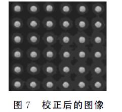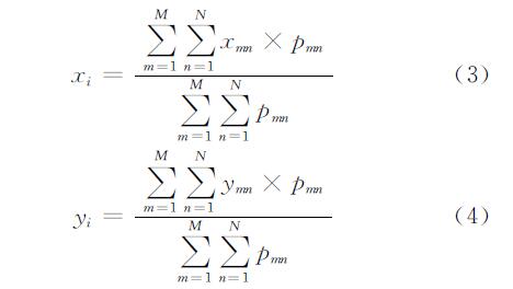 式中(x,y)為燈點區域的重心坐標,也就是相對應LED燈點的中心位置坐標;燈點區域的大小為M×N,M、N分別為燈點區域寬度和高度方向上的像素個數;(xmn,ymn)為燈點區域內圖像像素(m,n)的坐標,m、n分別為該圖像像素在該燈點區域內所處的行和列;pmn為燈點區域內該圖像像素(m,n)的二值化后的值。如圖2(c)所示,該方法能夠確定各個LED燈點的位置,并且由于使用了閾值分割的方法,能有效地避免燈點之間的相互干擾,使計算出的燈點的位置更加精確。