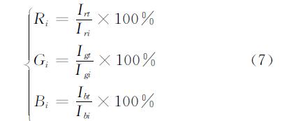 式中R、G、B分別為第i個燈點的紅色、綠色、藍色的校正系數;Irt、Igt、Ibt為三色校正目標值的相對亮度值;Iri、Igi、Ibi為第i個燈點三色相對亮度值。因此每個燈點所對應的校正矩陣為[R]T。