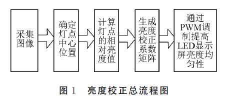 本文運用數字圖像處理技術對顯示屏上每個燈點的相對亮度進行檢測和提取,計算出各個燈點的校正系數矩陣,并運用脈沖寬度調制(PWM)方法調節相應燈點的亮度,從而提高全彩LED顯示屏的亮度均勻性。圖1為算法的總流程圖。