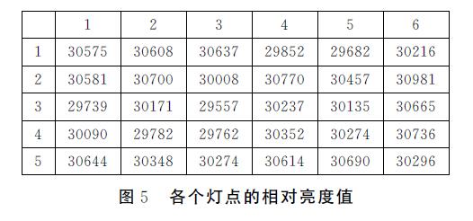 (2)以每個燈點的中心位置為中心,以操作距離為半徑作圓,如圖4所示,提取該圓形區域內的各個像素的灰度值進行求和。此灰度值的和即為該燈點的相對亮度值。在全部亮度提取完后保存為亮度數據文件,如圖5所示。