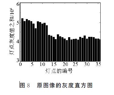 在確定燈點的具體位置之前,先要對采集到的圖像進行灰度分布的統計,在所獲取的感光圖像中,由于燈點一般是由矩陣的方式排列,且燈點區域與背景區域的灰度值存在明顯的差異,有時還會產生環繞光的現象,因此需對圖像進行二值化處理。本文采用了大津法(OTSU)確定閾值,該方法計算簡便,且在一定條件下不受圖像對比度和亮度變化的影響,所以應用非常廣泛。其原理如下: