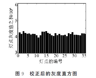 圖8和圖9分別為校正前和校正后各燈點的相對亮度值直方圖。通過比較可以看出,校正前直方圖數據的差異性比較大,而校正之后直方圖數據的差異相對比較小,在特殊的情況下,如果統計的數據不存在任何的差異,直方圖會呈現一條直線。從實驗數據中可以發現,在經過亮度校正后,亮度均勻性得到了很好的改善。