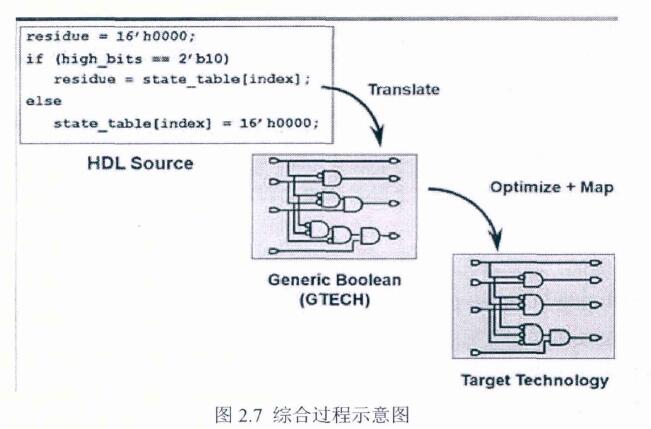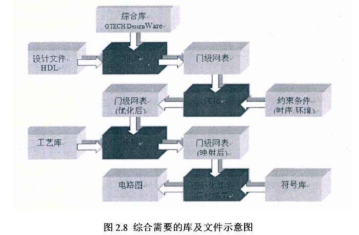 綜合一般由三部分組成, 分別是翻譯(Translate). 邏輯優化(Optimizing)和映射(mapping)。 如圖2.7所示,為綜合過程的示意圖。如圖2.8所示,為綜合需要用到的庫及文件。
